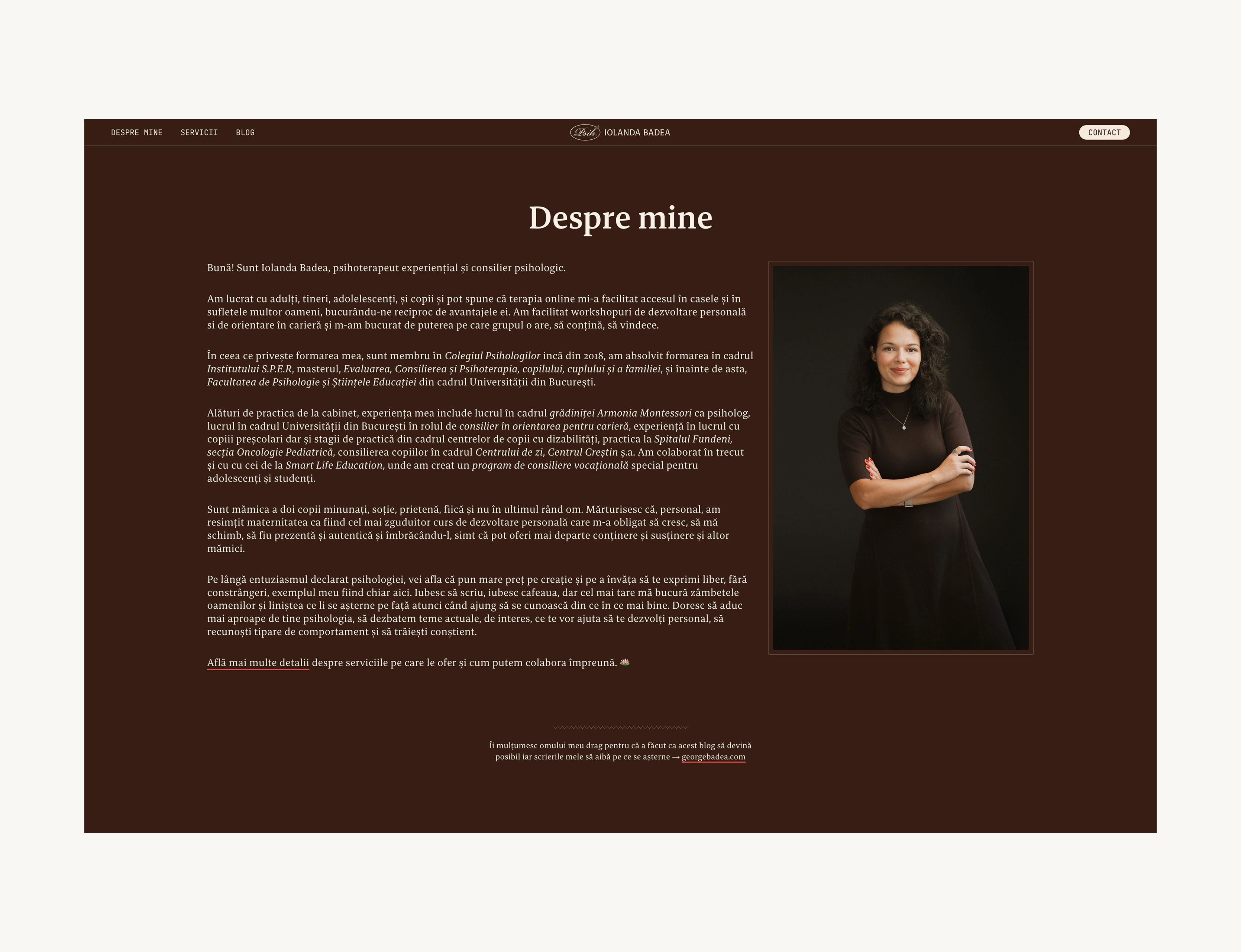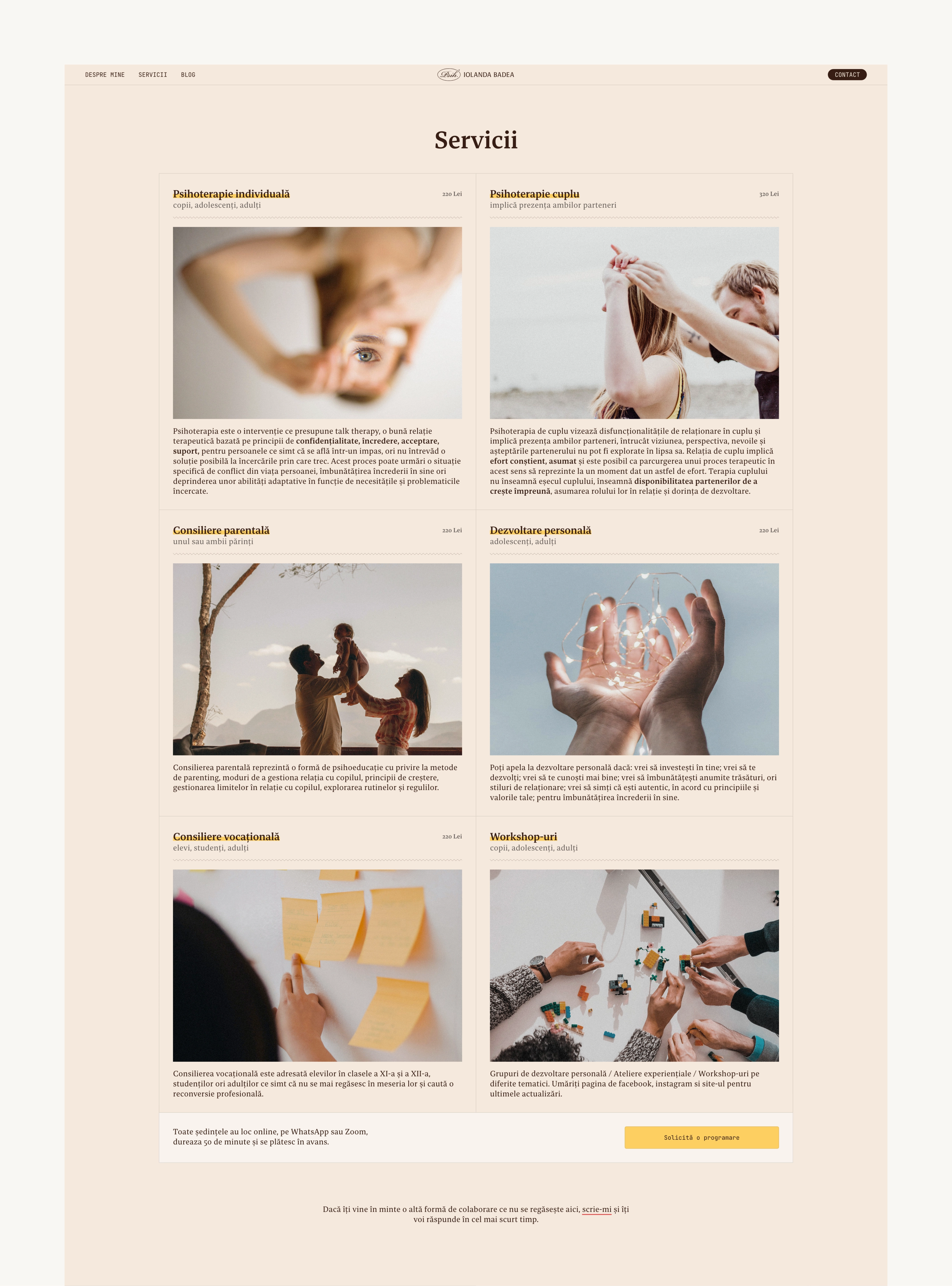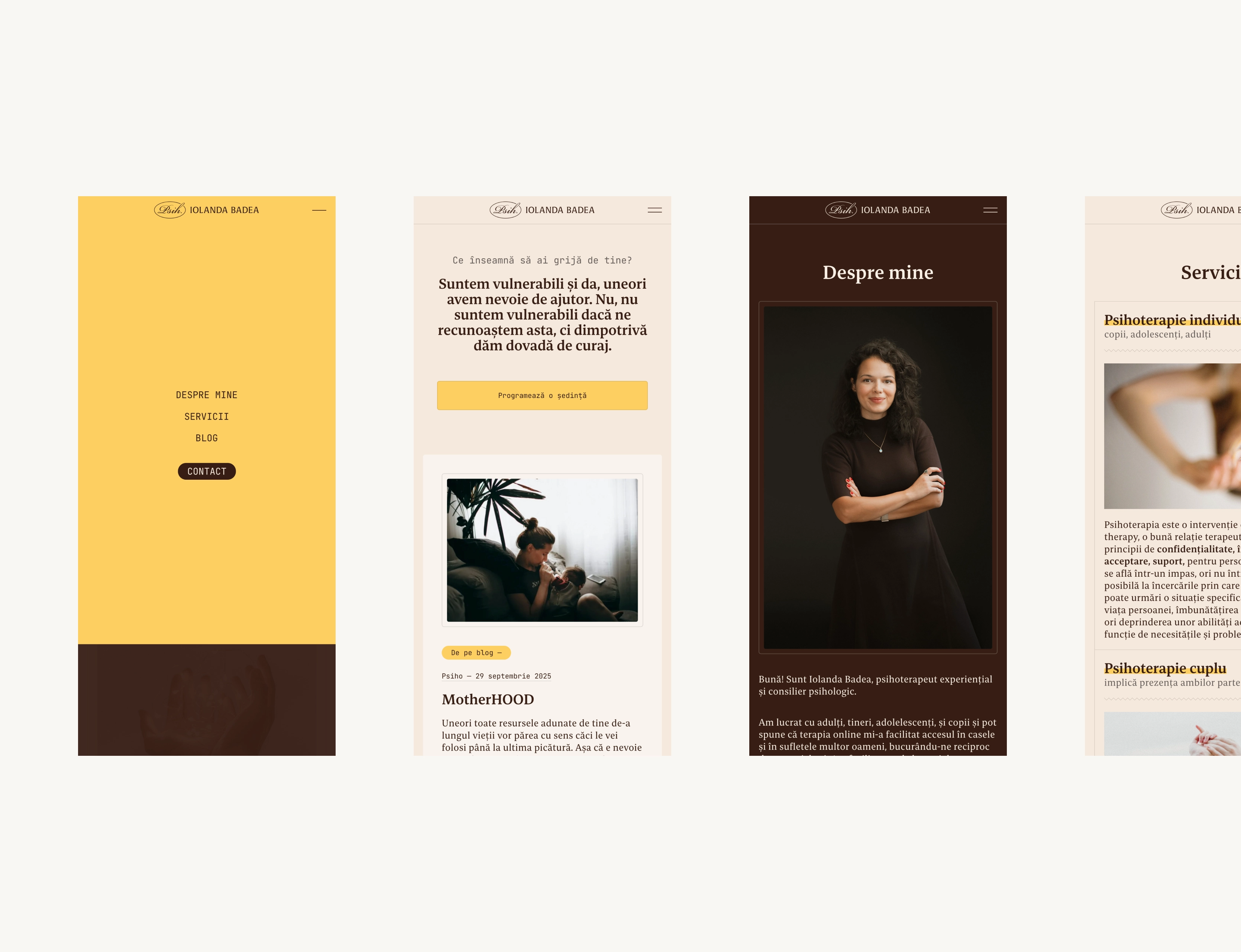 Website design and build for psychologist Iolanda Badea, presenting her professional profile, services, and writings. Designed with a focus on typography and smooth interactions, the warm, minimal interface ensures a pleasant, readable experience across devices.